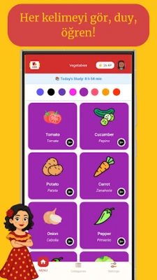 Sebzelerden hayvanlara, mesleklerden sayılara kadar çeşitli kategorilerde kelimeler öğrenin. Her kelime sesli ve görselli olarak sunulur, böylece hem telaffuzu duyar hem de görsellerle hafızanıza kazırsınız.