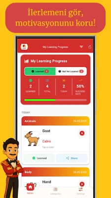 Kendi gelişiminizi anlık olarak takip edin. Çalışma süresi, öğrendiğiniz kelimeler ve tamamlama oranlarınız detaylı grafiklerle görüntülenir.