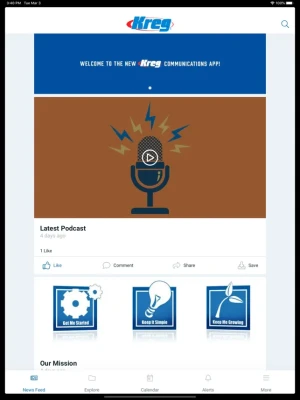 No matter where you are, the Kreg Toolbox puts all the information you need about Kreg Tool Company at your fingertips. Browse your newsfeed, like and comment on posts, and even take notes on different documents with just a few taps. Explore other functionality of the app, including the ability to: • Receive alerts regarding the most recent news, events, and important information• Add upcoming events to your device’s calendar• Stream both live and archived videos• Share content with your co-workers via your favorite social media channels and email• …and more!