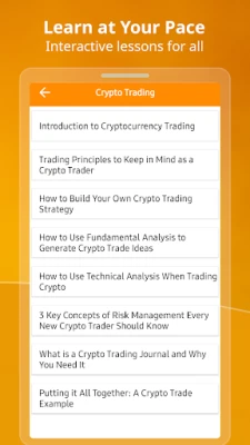 Kripto Ticaretini Öğren uygulamamız öğrenme deneyiminizi geliştirecek özelliklerle doludur. Kripto para birimi ticaretini çevrimdışı olarak öğrenebilir, böylece istediğiniz zaman, istediğiniz yerde öğrenmeyi kolaylaştırabilirsiniz. "Kripto Ticaretini Öğrenin" uygulamasını basit ve kullanıcı dostu olacak şekilde tasarladık; bu nedenle, kripto ticaretinde yeni olsanız bile, gezinmesi ve anlaşılması kolay olacaktır.