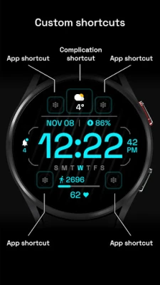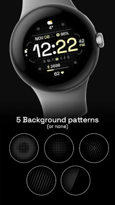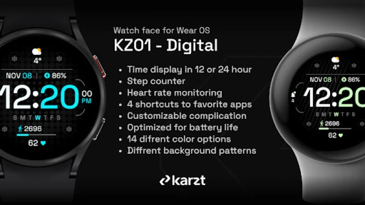 - Time display in 12 or 24 hour format - Optimized for battery life. - Date and day display - Battery life monitoring - Step counter with daily step goal of 10,000 - Heart rate monitoring - 4 shortcuts to favorite apps - Customizable complication (e.g. weather) - 28 different color options - Different background patterns
