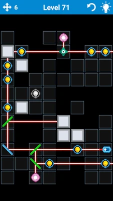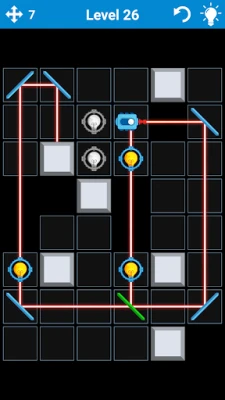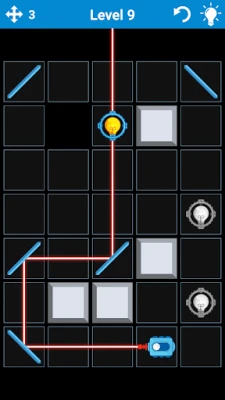 The goal of this puzzle game is to set up mirrors so all lights bulbs become turned on. You have for this different types of mirrored surfaces which reflect laser beams in different ways.