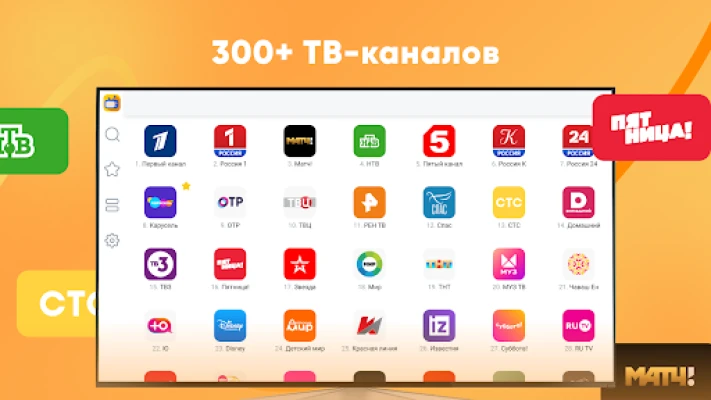 300+ телеканалов онлайн-ТВ бесплатно — всем, всегда и везде (как минимум на территории РФ). Первый канал, Россия 1, Россия 2, Россия 24, ТНТ, Культура, Мир, Пятый канал, Матч ТВ, Звезда, Пятница, НТВ, Карусель, СТС, Домашний, 2х2, Ю, Москва 24 и др. ТВ-каналы для любой аудитории в прямом эфире.
