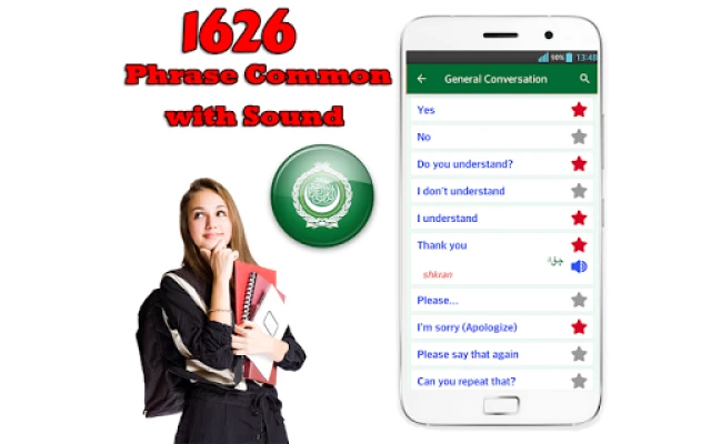 Learn Arabic Language Offline Pro Editor add 1626 common phrases in Arabic language. You can use all of them in everywhere and don't need network, never show ads with pro version.