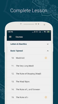 Kuran'ı Öğrenin Tajwid uygulaması kapsamlı dersler sağlar: çok temel konulardan ileri düzey Kuran Tajweed derslerine kadar, bu uygulamayı her seviyedeki öğrenciler için uygun yapar: hiç bilmiyorsanız da Kuran Majeed nasıl okunur, ya da okuyabilir, ancak tecvid/tajweed ve makhraj, yani tahsin veya Kuran tilaveti geliştirmek isteyebilirsiniz.