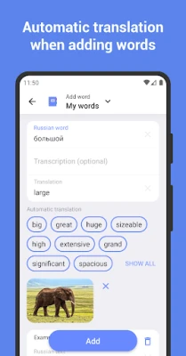 • Easily add your own flashcards: translations, pictures, and example sentences are automatically filled in.