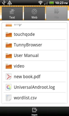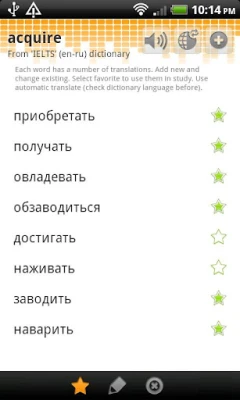 Import words from everywhere, translate them on the go and learn with the help of four different study types. It is easy to open web site or book on desired language and import all content to your own dictionary. Automatic translation protects you from manual searching and typing. Study reminder helps you to build your own schedule.