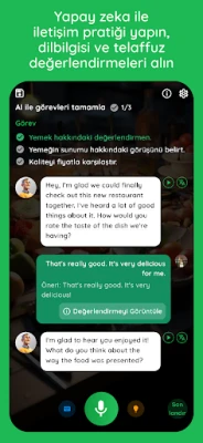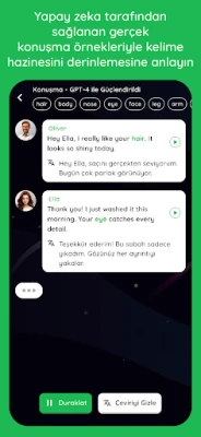 - Yapay Zeka ile sohbet edin: Akıllı Yapay Zeka ile sohbet edin, yemek siparişi, iş görüşmeleri veya sıradan konuşmalar gibi gerçek hayattaki iletişim durumlarını simüle edin. Yapay Zeka, zorluk seviyesini seviyenize göre ayarlayarak her gün gelişmenize yardımcı olur.