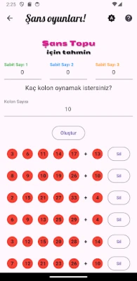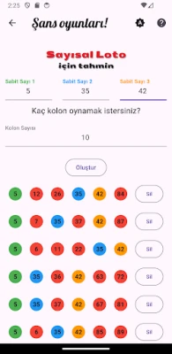 Çılgın Sayısal Loto, Süper Loto, On Numara ve Şans Topu oyunları için istediğiniz ölçüde tahmin oluşturan bir yardımcı uygulamadır. Uygulama, herhangi bir algoritma üzerinden değil, rastgele üretilen sayılar üzerinden tahmin üretir. İlgili oyunlar için doğru tahmin garantisi veremez, bu tamamen kullanıcının şansına kalmıştır.