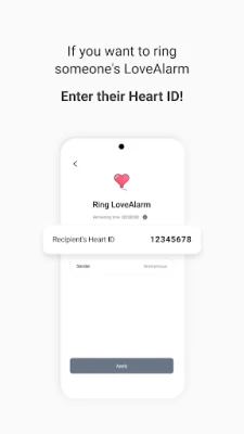 Enter the other person's Heart ID to ring their LoveAlarm, and share your Heart ID to others to receive a LoveAlarm.