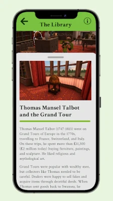 - On-site AR experience: When visiting Margam Castle, unlock a fully immersive 1:1 AR recreation of the rooms as they once were, with interactive hotspots that reveal hidden historical facts, artefacts, and stories. The on-site AR is seamlessly integrated using location services and QR codes, enhancing your visit with digital storytelling.