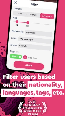 3 milyondan fazla indirme! Yıllık toplam 20 milyondan fazla mesaj Yıllık toplam 2,5 milyondan fazla eşleşme 80'den fazla ülkede TOP 10'da yer alıyor (Eğitim kategorisi) Kültürel değişim eşleştirme uygulaması Japonya'da üretildi!