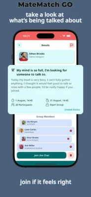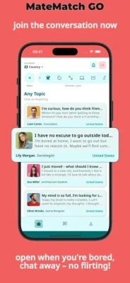 MateMatch GO is a friendly social app designed to help you instantly connect with new friends nearby. Join topic‑based chat rooms tailored to your interests—from sports and books to outdoor adventures and study groups. Whether you want to share ideas, find activity buddies, or just have casual conversations, MateMatch GO provides a welcoming, safe space for authentic connections. No pressure for meetups—just chat, relax, and make new friends on your own terms. Easy sign‑in with Google or Apple accounts and flexible privacy controls keep your experience smooth and secure. Start chatting and discover your community today!