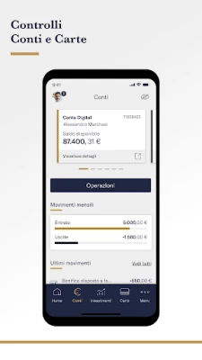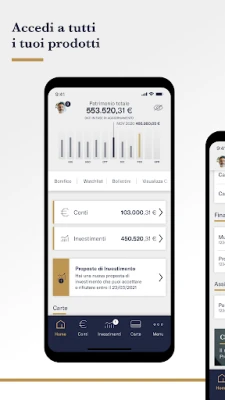 Vedi subito il valore totale del tuo patrimonio, il suo andamento nel tempo e accedi rapidamente ai tuoi prodotti. Bonifici, pagamenti, ricariche, giroconti, nuovi vincoli: direttamente dalla Home hai a disposizione le principali operazioni.