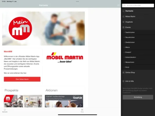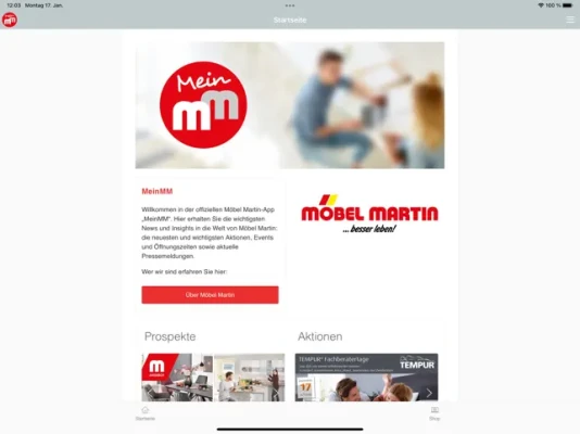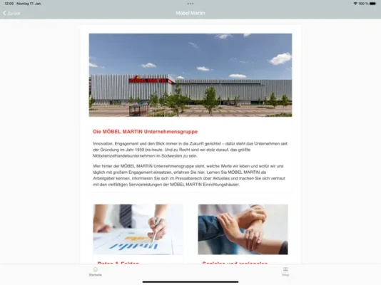 +++FEATURES+++ Möbel Martin Insights: Geschichte und Entwicklung eines erfolgreichen Familienunternehmens, soziales und regionales Engagement, Standorte Services - immer aktuell. Unter Angebote und Events findest Du die neusten und wichtigsten Angebote, Aktionen und Veranstaltungen für die Öffentlichkeit. Auf Jobsuche? Auch aktuelle Stellenanzeigen nach Standorten und Bereichen (Verkauf, Logistik u.v.m.) gibt es auf einen Blick.
