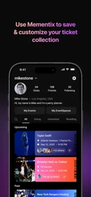 Mementix – Your Social Hub for Live EventsSee what's happening and who's going with your personalized EventFeed™. Discover the events your friends are attending or excited about, and never miss a chance to experience something together. Collect and customize every ticket in your personalized stub collection, adding photos, videos, and notes so every memory lasts forever. Coordinate, chat, and share with friends in EventSpace™, your built-in hub for planning, media, and community around every event.