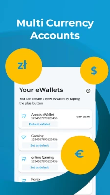 • Hold up to nine different currency eWallets