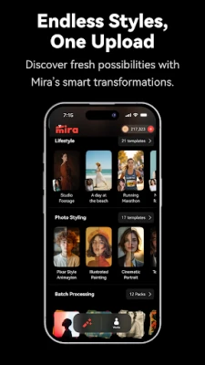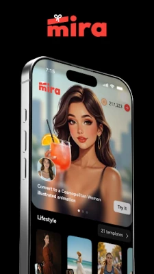 Mira is an all-in-one AI creative app for photos, videos, portraits, stickers, and trending AI styles.