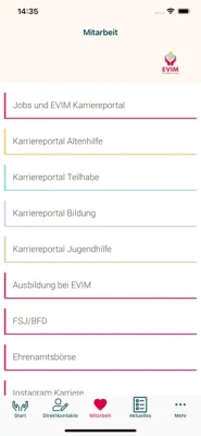 Die App des Evangelischen Vereins für Innere Mission in Nassau - EVIM - bietet schnellen Zugang zu Jobangeboten, zur Ausbildung und zum Freiwilligen Engagement in den Arbeitsfeldern: Altenhilfe, Teilhabe, Jugendhilfe, Bildung und Serviceangebote. Schneller näher dran sind Sie auch über das Modul Direktkontakte an über 60 großen sozialen Einrichtungen und Angeboten von EVIM in Hessen und Rheinland-Pfalz und an News über unsere Arbeit. Außerdem bietet der Marktplatz in der App schnellen Zugang zu unseren Dienstleistungen.