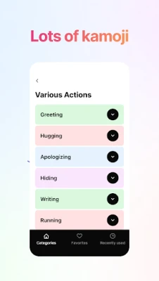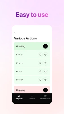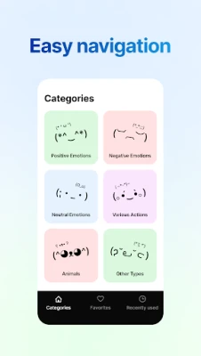Uygulama, Alt Navigasyon menüsünü kullanarak kolayca erişilebilen Ana Sayfa, Favoriler ve Son Kullanılanlar olmak üzere üç ana ekran içerir. Ana Sayfa ekranı, kategorilere ve alt kategorilere ayrılmış geniş bir kaomoji koleksiyonu içerir ve kullanıcıların gezinmesini ve arama yapmasını kolaylaştırır.