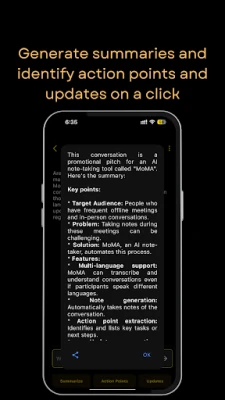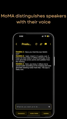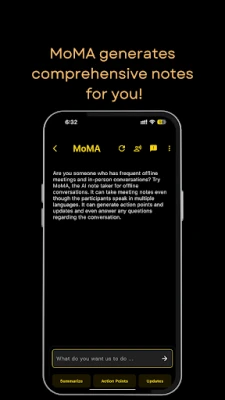 Stay focused on the conversation-MoMA takes care of the notes. Designed for professionals, students, and anyone who values time and accuracy, MoMA transforms your offline meetings and casual conversations into organized, actionable insights.
