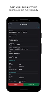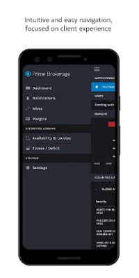 Cash wire summary with approve/reject functionality Centralised dashboard providing a clear and concise overview of key items requiring attention Securities lending excess/deficit summary Margin Summary Screen The app also has 2 factor authentication, including Android Fingerprint Authentication.