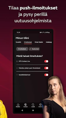 MTV Katsomon käyttäminen edellyttää sisäänkirjautumista. Kirjauduttuasi sisään voit luoda listoja suosikkiohjelmistasi ja jatkaa katselua siitä mihin jäit, laitteesta riippumatta. Voit myös tilata sovellukseen ilmoituksen, kun suosikkisarjastasi on ilmestynyt uusi jakso.