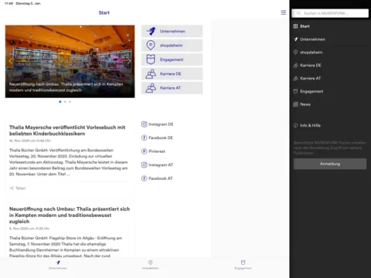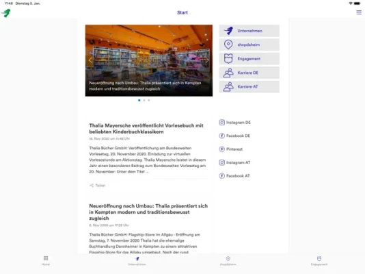 Die ThaliaApp ist eine Kommunikations-App für Kunden, Partner und Mitarbeitende der Thalia Mayersche Gruppe. Hier erhalten Sie alle aktuellen Informationen rund um das Buchhandelsunternehmen. Die App bietet einen Zugang zum Karriereportal des Unternehmens, einen Überblick aktueller Pressemitteilungen und eine direkte Verknüpfung mit der Plattform shopdaheim.Die Thalia Mayersche Gruppe ist ein Buchhandels- und Serviceunternehmen mit Hauptsitz in Hagen. Als Marktführer im Sortimentsbuchhandel im deutschsprachigen Raum umfasst Thalia Mayersche heute rund 350 Buchhandlungen in Deutschland und Österreich.