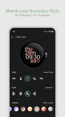 The watch face presents you with 5 data sources, 4 styles, 30+ handpicked color palettes and 15+ color gradients to match your everyday styling.