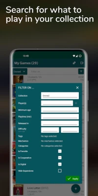 Oynamak için bir tahta oyunu seçmek her zaman kolay değildir, bu yüzden koleksiyonunuzu filtrelemek için size birden fazla seçenek sunuyoruz: isim, ortak oyun, oyuncu sayısı, oyun süresi, çıkış yılı, dijital, zorluk, etiketler veya / ve bir favori.