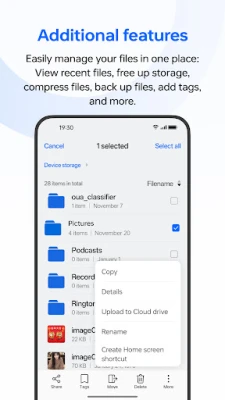 Additional features Easily manage your files in one place: View recent files, free up storage, compress files, back up files, add tags, and more.