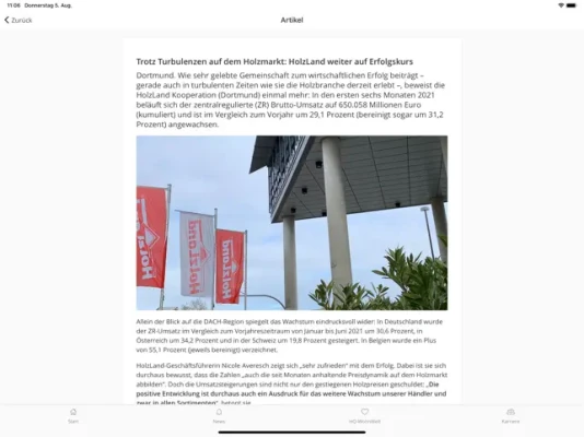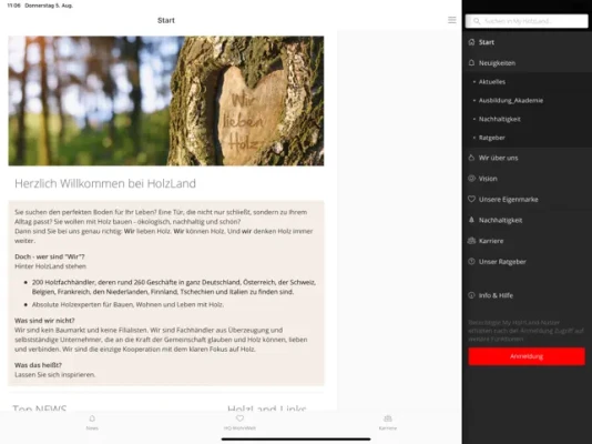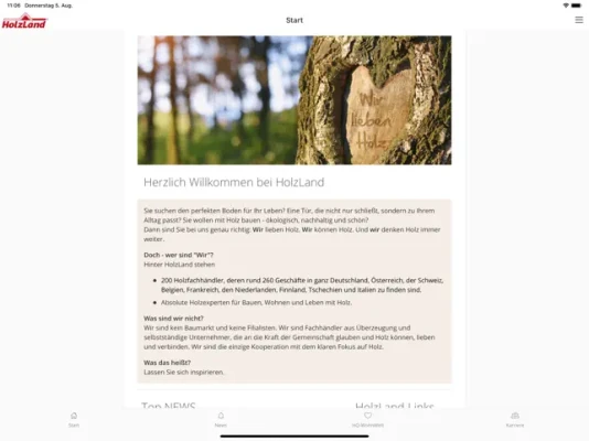 Sie suchen hochwertige Produkte für ein nachhaltiges Wohnen und Bauen mit Holz? Dann sind Sie bei my HolzLand genau richtig, der App der HolzLand-Kooperation. Im öffentlichen Bereich finden Sie jede Menge Infos über unsere Gruppe, unsere Mitglieder, unseren Holzhändler-Marktplatz holzland.de, unsere Eigenmarke HQ mit modernen Fußböden, innovativen Türen und Terrassendielen sowie offene Stellenangebote. Kurz gesagt: Auf my Holzland bündeln wir all unsere Informationen, Daten, Neuigkeiten und Kampagnen – übersichtlich, schnell und transparent. My HolzLand ist unser Intranet für die Hosentasche und zentrales Element unseres digitalen Selbstverständnisses.