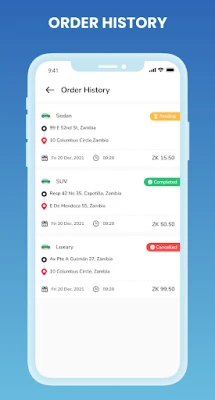 History You have an option to see the past ride history with the details of date & time, address, and amount.