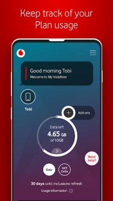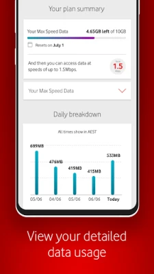 The features of the app are subject to change. The app is free but download charges apply for downloading from the Google Play Store. Non Vodafone customers can download the app however data charges will apply as per your plan rate. When accessing the app overseas, international roaming charges will apply. When on Wi-Fi, My Vodafone may not continuously update if you’ve logged out of the app.