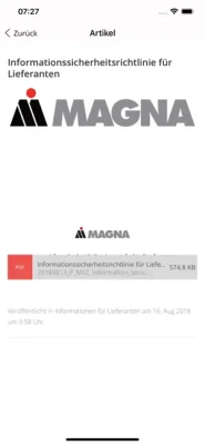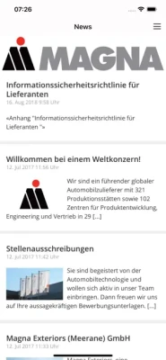 myMAGNA ist die App für Mitarbeiter, Partner sowie Freunde an den deutschen Produktionsstandorten Meerane und Leipzig des Automobilzulieferkonzerns MAGNA International. Die App versorgt Sie mit den aktuellen Unternehmensnachrichten, Terminen und Ankündigungen. Gleichzeitig bietet sie bequem die Möglichkeit, Ideen und Verbesserungsvorschläge im Unternehmen einzureichen. Ebenso finden Sie in der App aktuelle Stellenangebote und Anfahrtsbeschreibungen. Die Mitarbeiter-App myMAGNA kann auf privaten und geschäftlichen Smartphones installiert werden und bietet folgende Funktionen im Überblick: