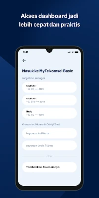 Rasakan login cepat menggunakan lebih dari satu nomor Telkomsel dan nomor layanan lainnya, seperti IndiHome, Orbit, atau EZnet. Info loginmu akan tersimpan dan akses langsung ke menu yang sesuai dengan layanan yang digunakan.