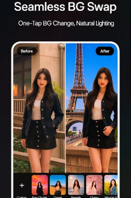 Remove or change the background of any photo in one tap and export clean transparent PNGs for ecommerce and social media.