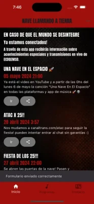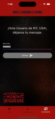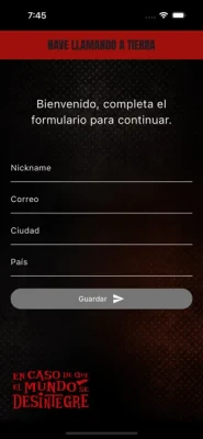 Esta aplicación es el nexo comunicativo entre la Nave María Tijuana y la Tierra. Será utilizada como alarma para anunciar todo aquello que ocurra en el espacio desintegrado formando parte del clásico Nave Llamando a Tierra. Así esta APP será una óptima herramienta de comunicación de todo lo que la nave necesite informar. Información de programas especiales, novedades, transmisiones, estrenos, noticias relacionadas con En caso de que el Mundo se Desintegre.