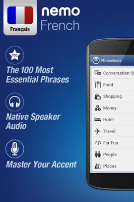 Nemo is designed to start you speaking the most useful words in French immediately and confidently. With millions of downloads from around the world, Nemo is now available for Android phones and tablets.