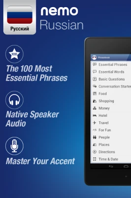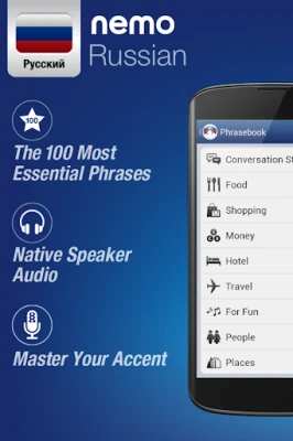 Nemo is designed to start you speaking the most useful words in Russian immediately and confidently. With millions of downloads from around the world, Nemo is now available for Android phones and tablets.