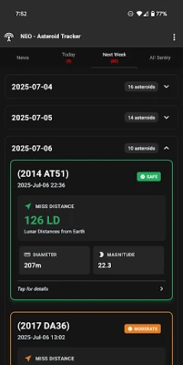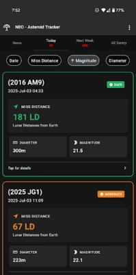 🌌 Découvrez l'espace depuis votre téléphone avec NEO - Asteroid Tracker, l'application qui vous permet de suivre en temps réel les astéroïdes approchant de la Terre. Grâce aux données de la NASA, soyez informé(e) des objets spatiaux qui passent près de notre planète et restez à jour avec les dernières actualités du CNEOS.