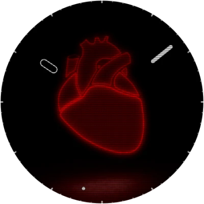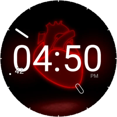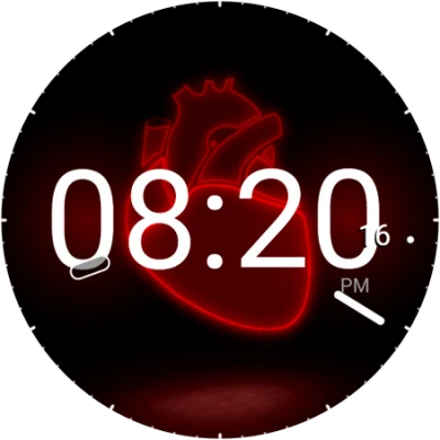 If u turning your wrist to your direction, written time fades in. 24h / ampm The heart beats in every seconds. In every min red neon juice splatters all over the screen. Love hurts..