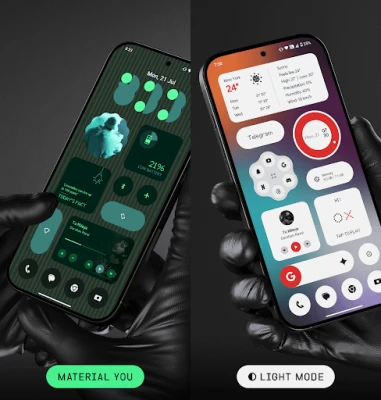 Widgets support dark mode, light mode, and Material You mode.