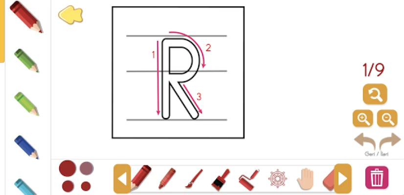 Harfin yazılışı, hissetme, heceleme, cümle okuma çalışmaları ile öğrenmenize yardımcı olacak uygulamamızda isterseniz önce boyama çalışması ve çizgi çalışması yapabilirsiniz.