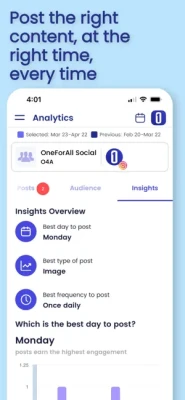 Based on several factors, OneForAll Social tells you the best day(s) and time(s) to post per account and platform, in order to gain the highest level of engagement with your audience.