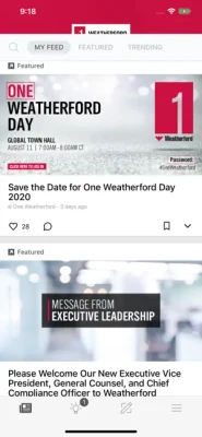 ∙ Discover the latest company news anytime and anywhere ∙ Receive personalized notifications in real-time for announcements and information that matter to you ∙ Connect with your community by sharing photos, submitting content, and providing feedback ∙ Work as One Weatherford