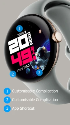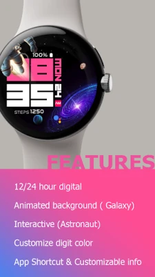 Digital interactive watch face with a space theme, animated galaxies in the background, and flying astronauts who can be interacted with by tapping the watch screen. Features : - 12/24 hour digital - Animated background ( Galaxy) - Interactive (Astronaut) - Customize digit color - Customizable info - App Shortcut - Always On Display