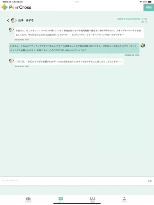 ・マッチングすると、マッチングした相手とアプリ内でメッセージが送れるようになります。メッセージのやり取りで、オンラインかリアルで面会頂き、社外のワーキングマザーの方との出会いをお楽しみください。