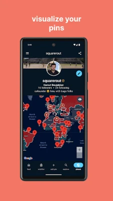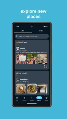 Your home feed is where you’ll see where in the world your friends have pinned. We have an explore page where you can search for and follow new friends, and see where other travelers have pinned so far to inspire your future trips.