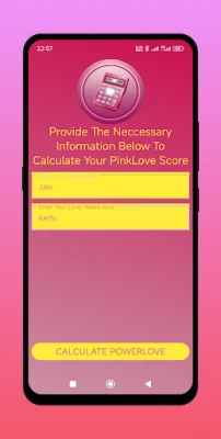 This is a pinkish colour styled love calculator App. It is free to use and made specially for pink colour lovers. Launch the App and calculate the Love percentage between you and your partner in a pinkish themed App.